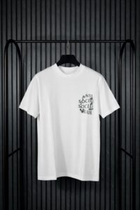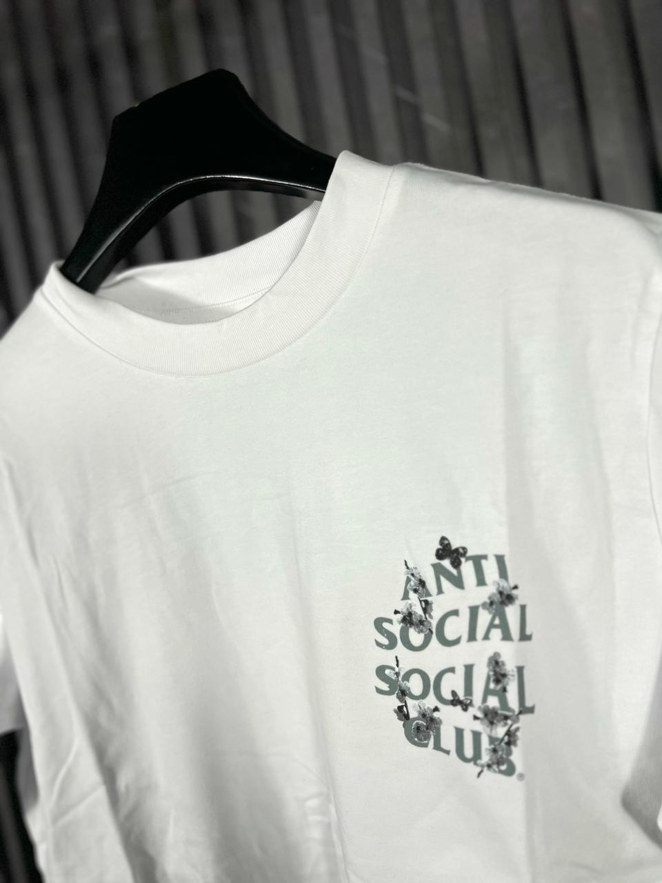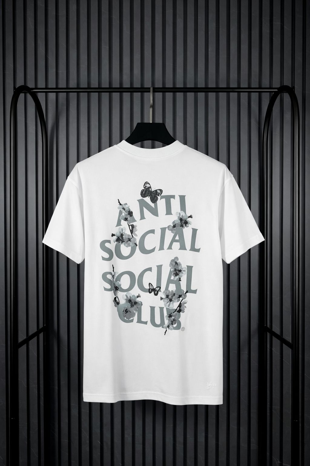 El diseño incorpora el clásico texto “Anti Social Social Club”, acompañado de flores estilo blossom y mariposas que rodean el logo, creando un contraste visual atractivo sobre la base blanca. Esta mezcla entre minimalismo y arte gráfico refleja el estilo moderno y urbano que ha convertido a la marca en una referencia dentro del streetwear.