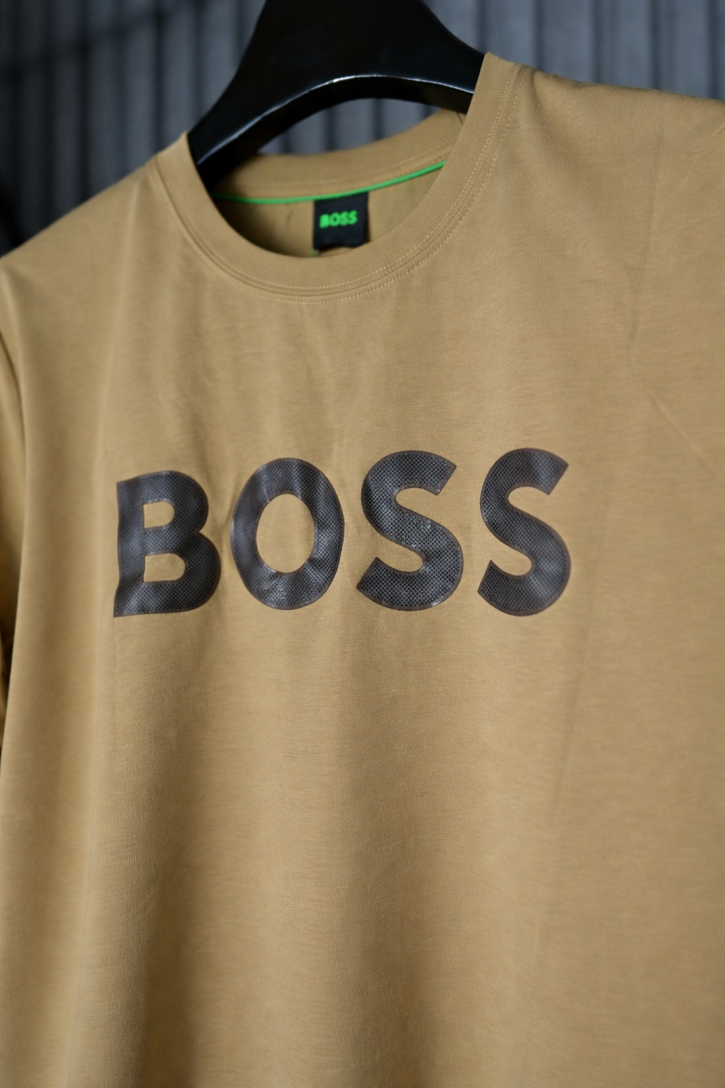 El diseño de esta playera se centra en su elemento principal: el logo BOSS en gran formato, colocado estratégicamente en el pecho para generar un impacto visual equilibrado.