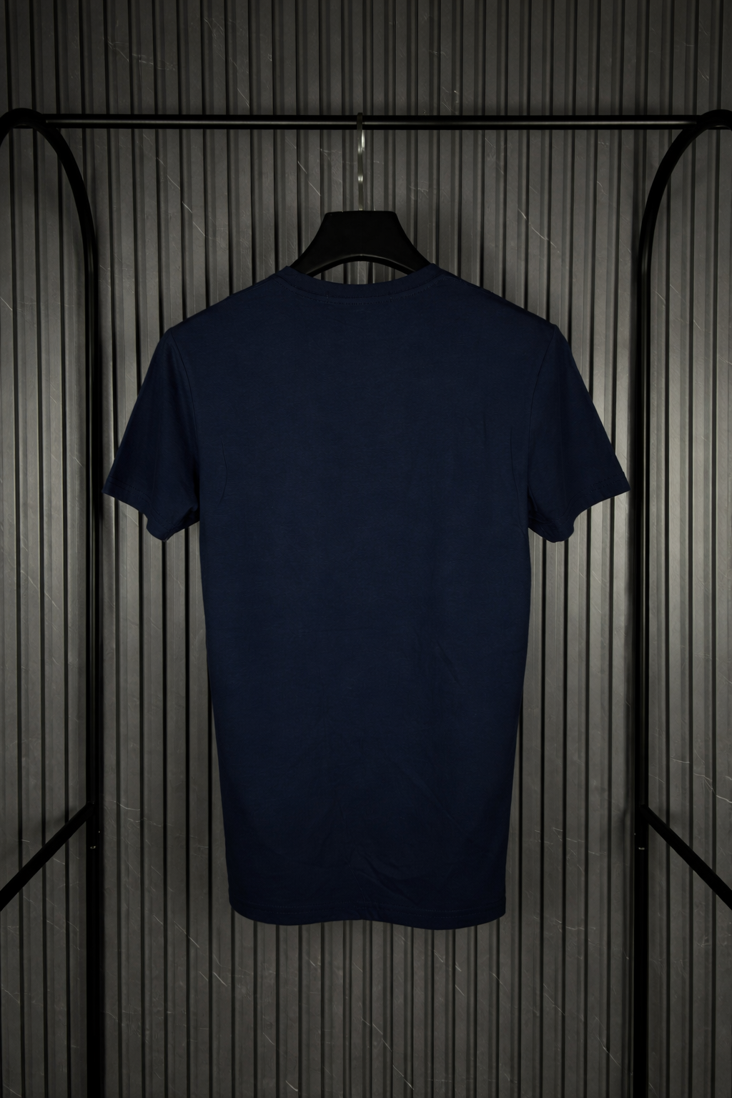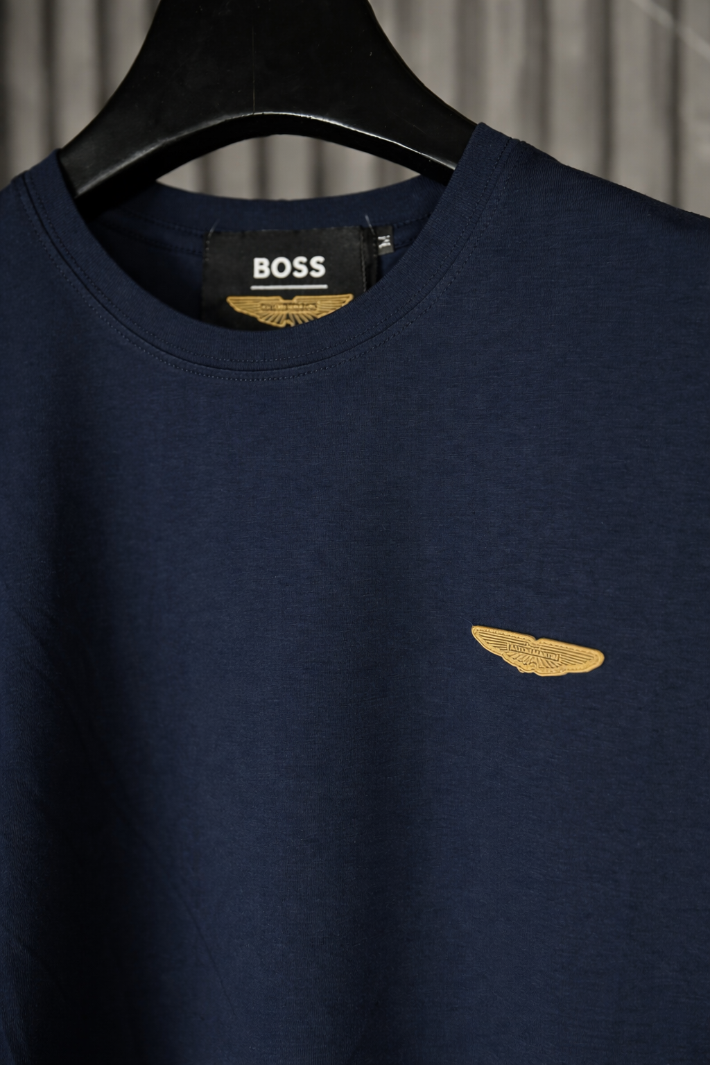 Playera BOSS azul marino con emblema tipo Porsche, diseño elegante y deportivo ideal para un look premium moderno.