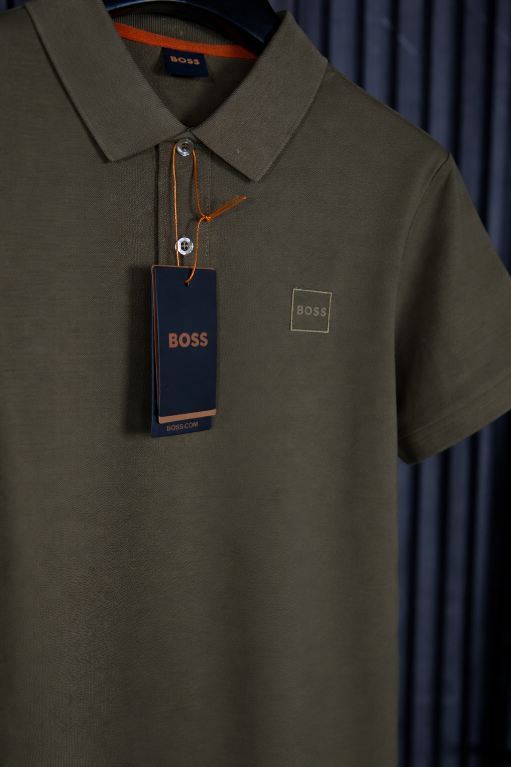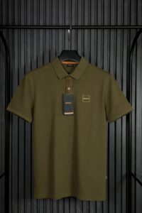 Su tono verde olivo aporta una estética sofisticada y diferente a los colores tradicionales, convirtiéndola en una opción ideal para quienes desean destacar con clase. El logo BOSS enmarcado en un diseño tipo cuadro al pecho añade identidad de marca sin saturar la prenda, manteniendo una apariencia limpia y refinada.