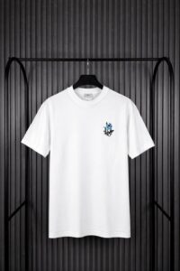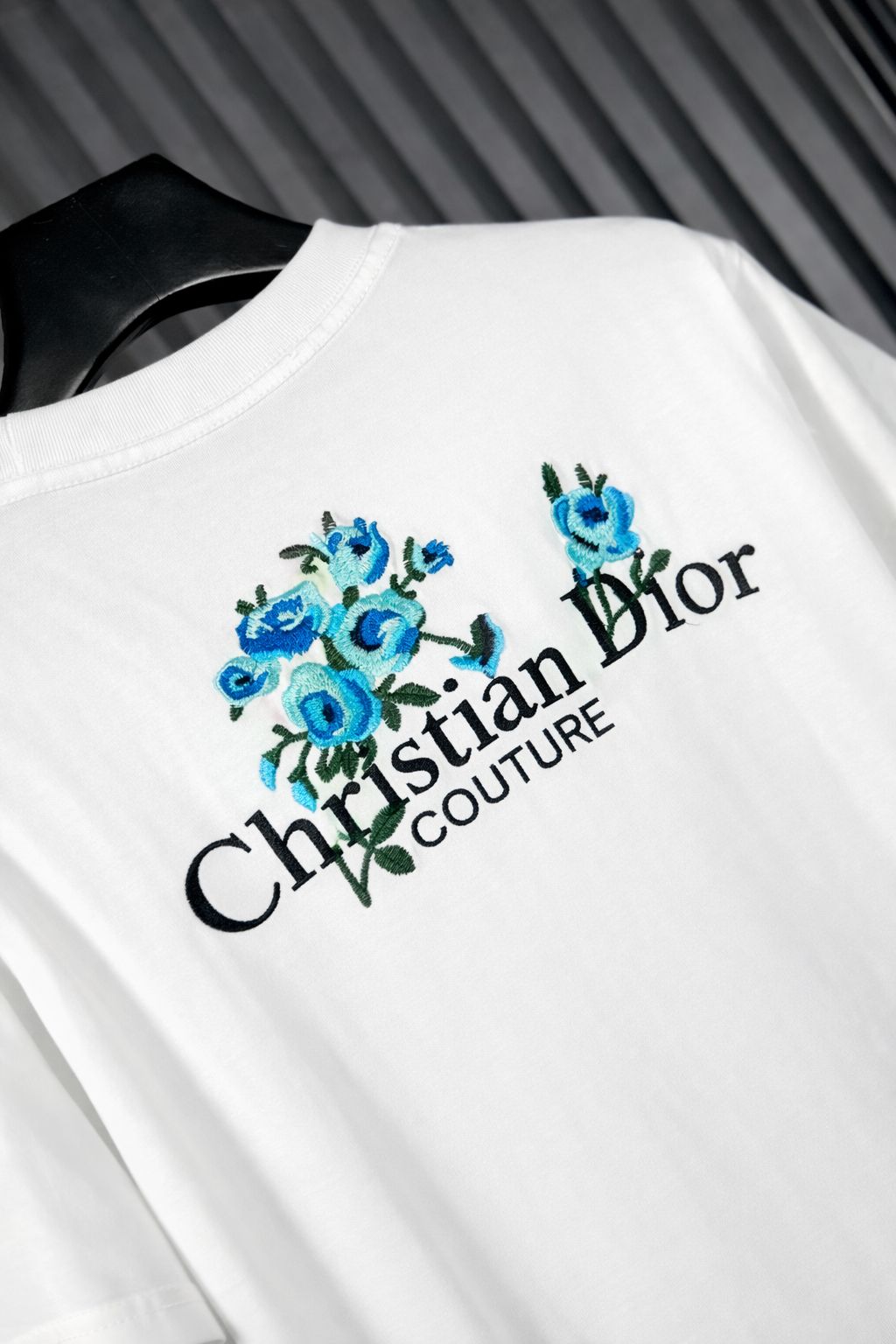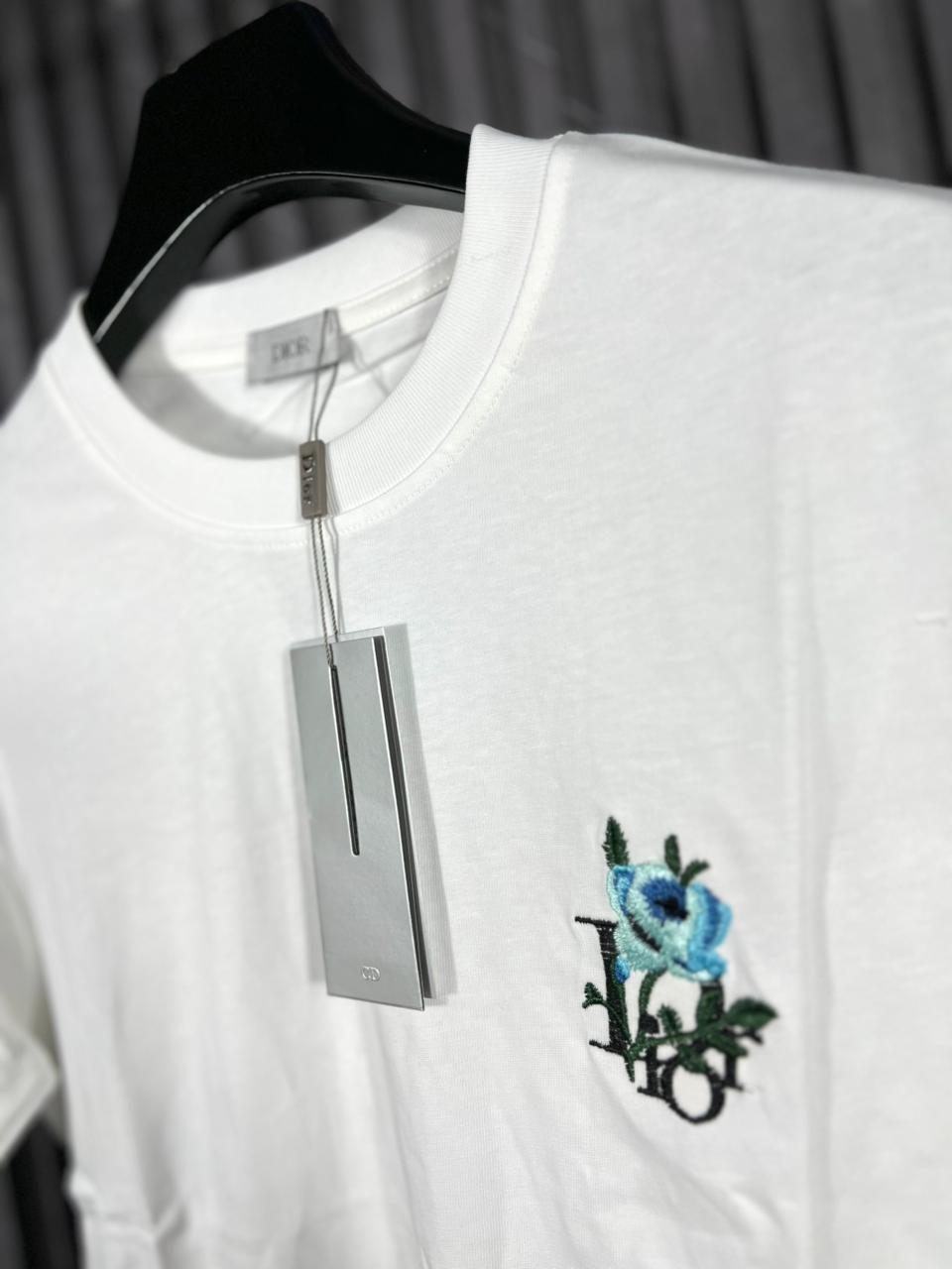 Playera Christian Dior Couture estilo premium en color blanco con bordado floral en tonos azules integrado al logo de la marca, creando un diseño elegante y moderno. Confeccionada en algodón de alta calidad que ofrece comodidad, suavidad y un look sofisticado.