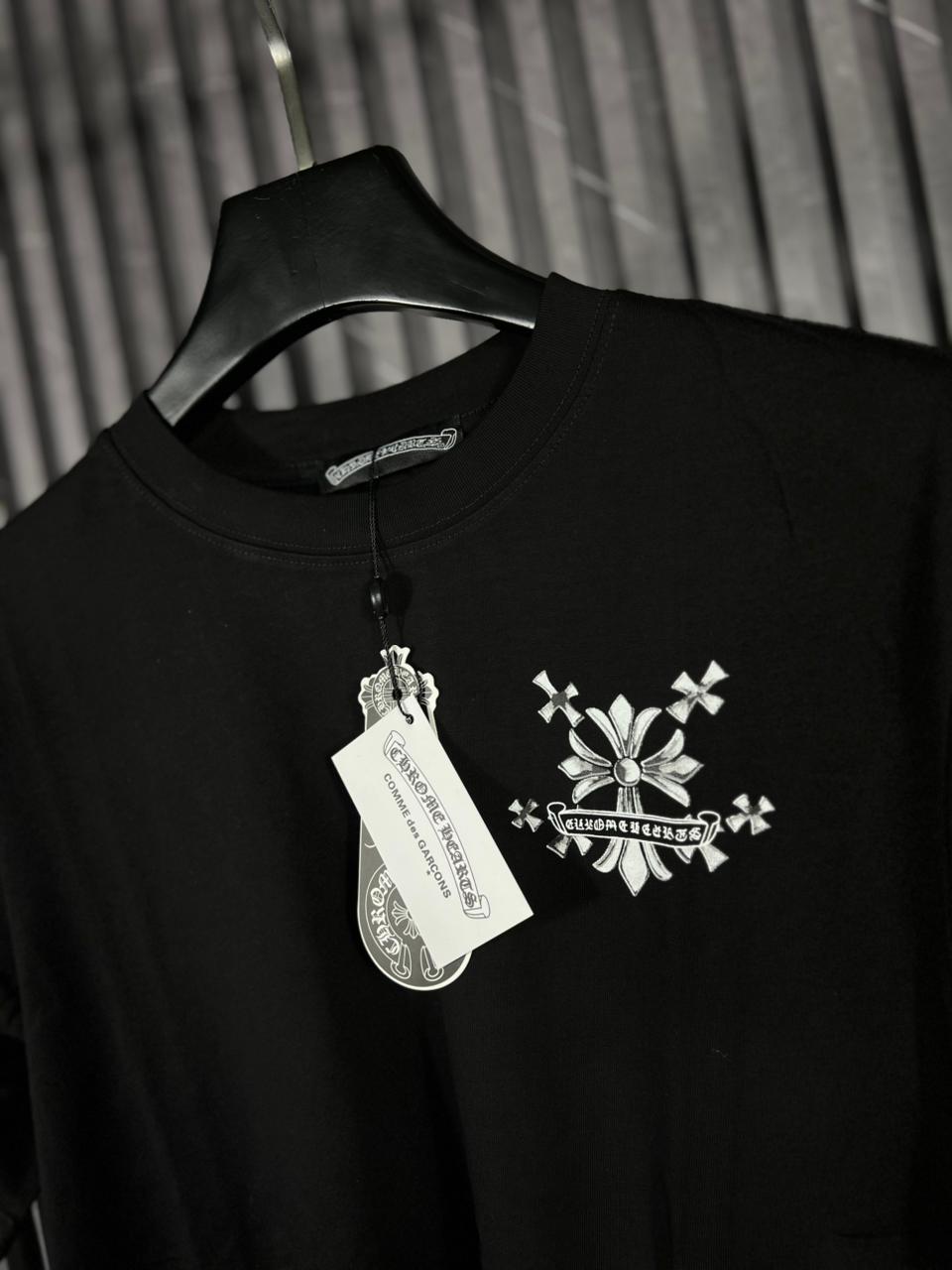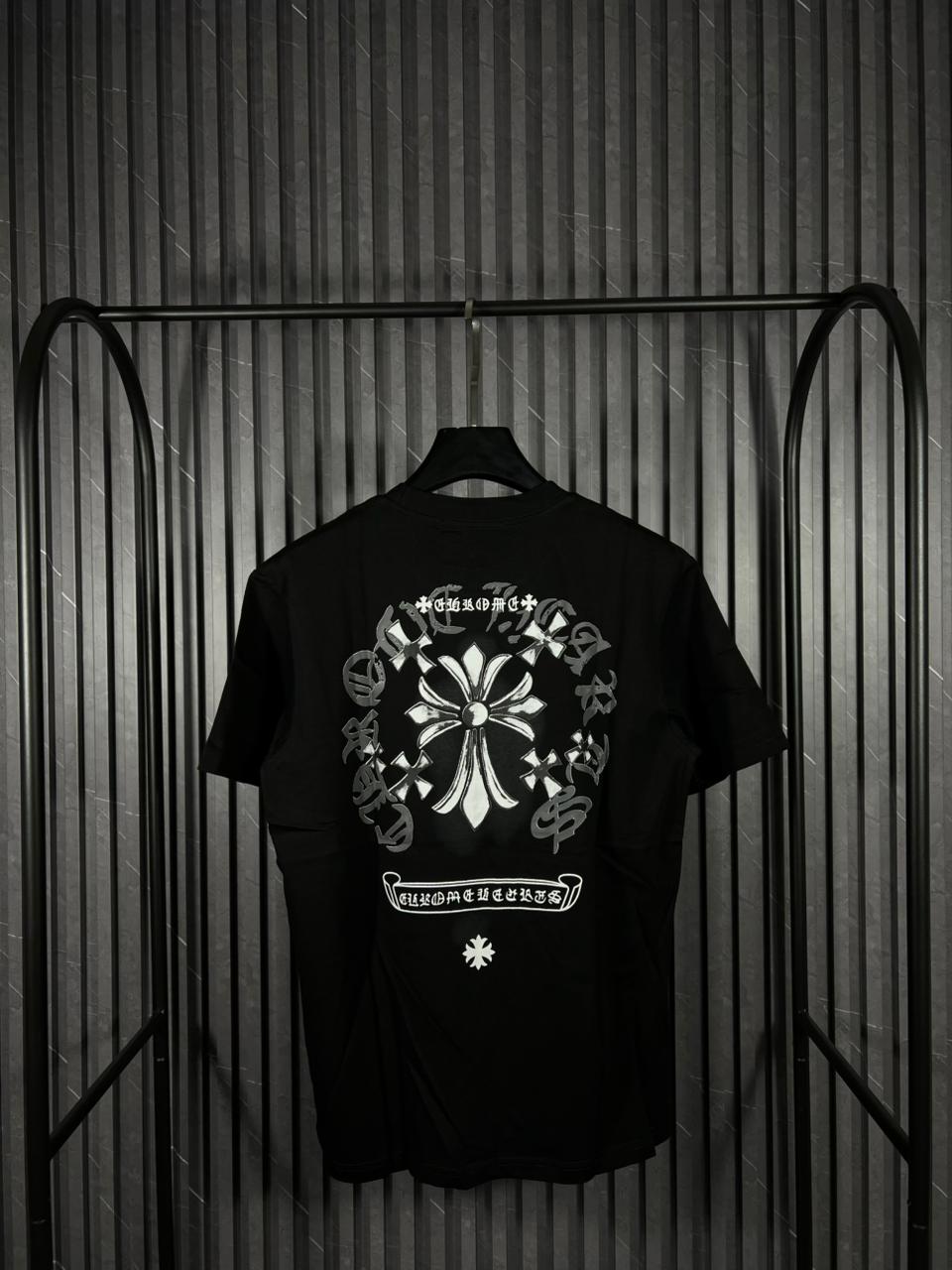 Playera Chrome Hearts estilo streetwear premium en color negro con cruz gótica frontal y diseño Multi Cross grande en la espalda, acompañado de tipografía clásica de la marca. Confeccionada en algodón de alta calidad que ofrece comodidad, suavidad y un look urbano de alto impacto.