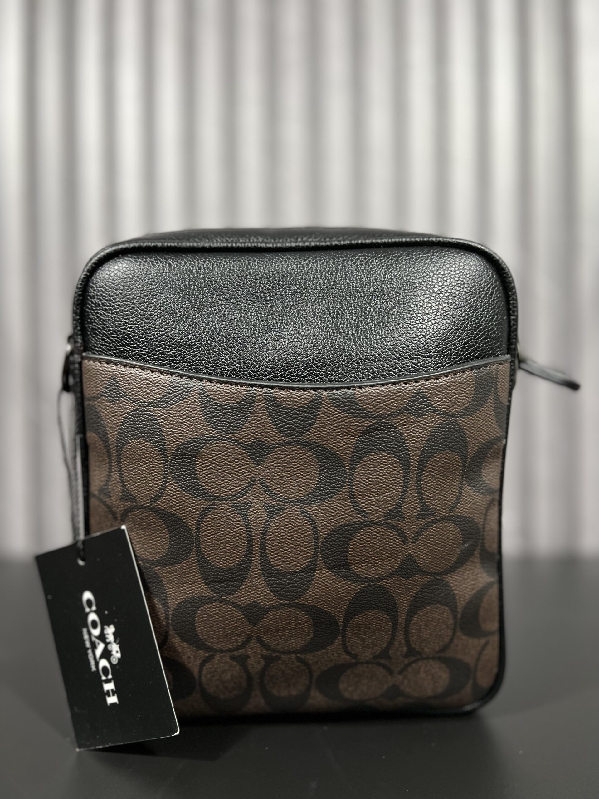 El diseño de esta bandolera destaca por la mezcla entre canvas con monograma en tono café oscuro y paneles superiores en negro, creando un contraste elegante que refleja el estilo característico de Coach. La solapa frontal con cierre aporta seguridad y un aspecto estructurado que eleva la presencia del bolso, mientras que su tamaño compacto permite transportar los objetos esenciales del día a día con comodidad.