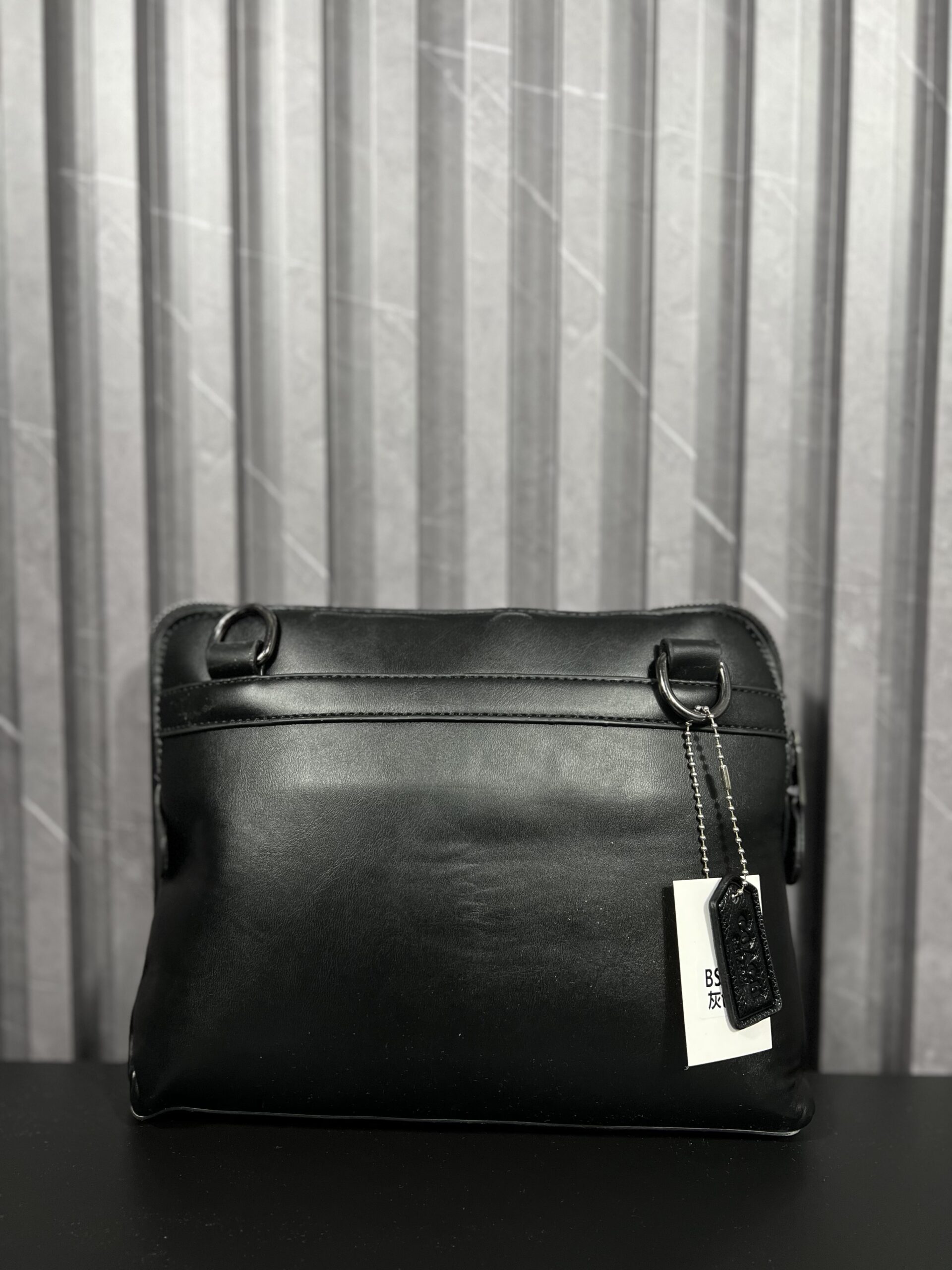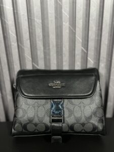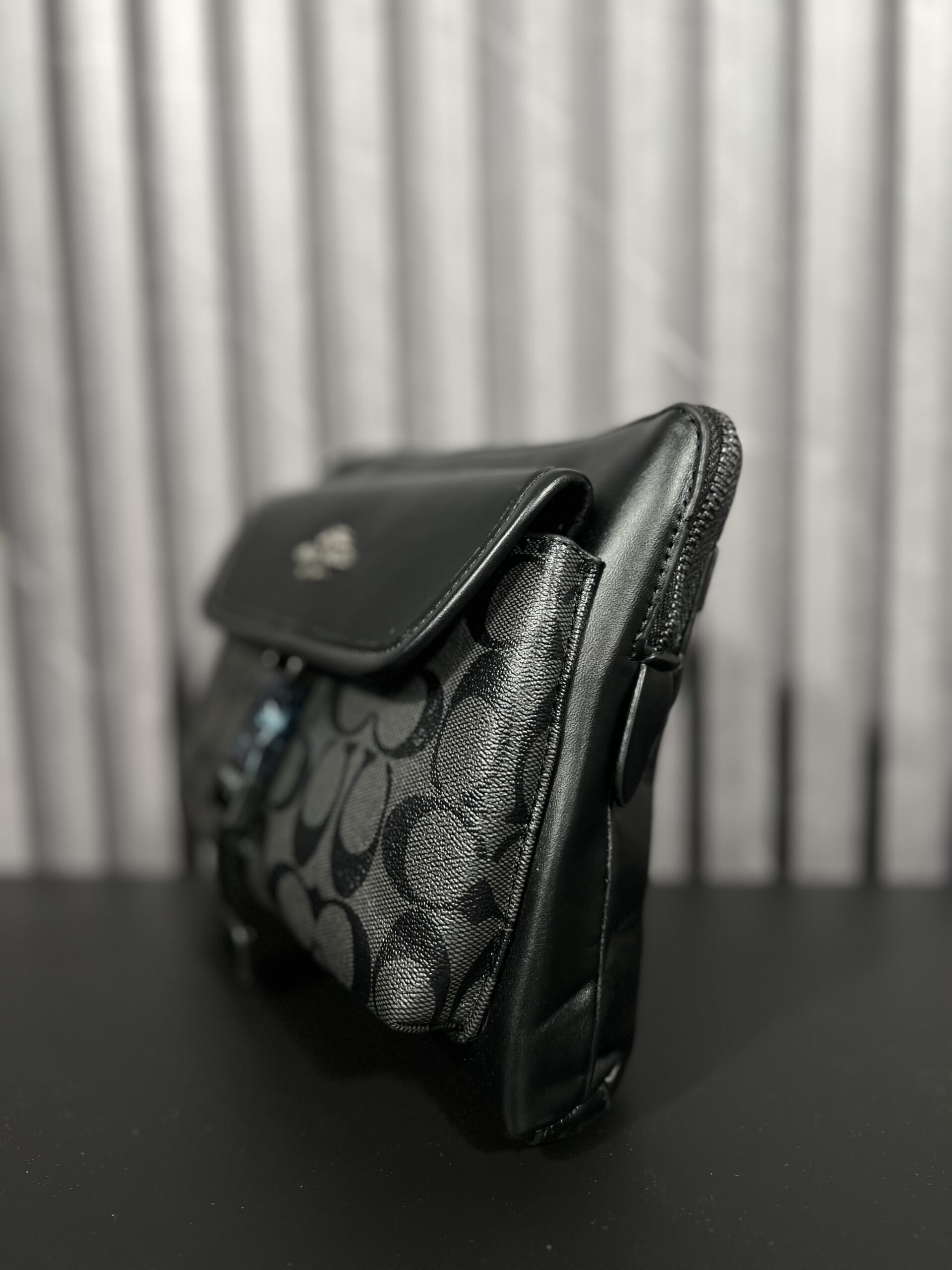 El diseño integra una solapa superior en material tipo piel negra con el icónico logo metálico de Coach, acompañado de una correa frontal con broche central que aporta un estilo más técnico y moderno. Esta combinación entre el monograma oscuro y los acabados en negro genera un accesorio elegante y discreto, ideal para quienes buscan una bandolera premium con presencia urbana y estética contemporánea.