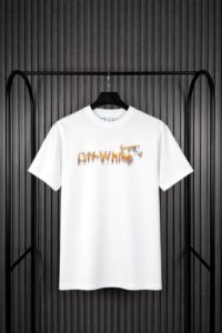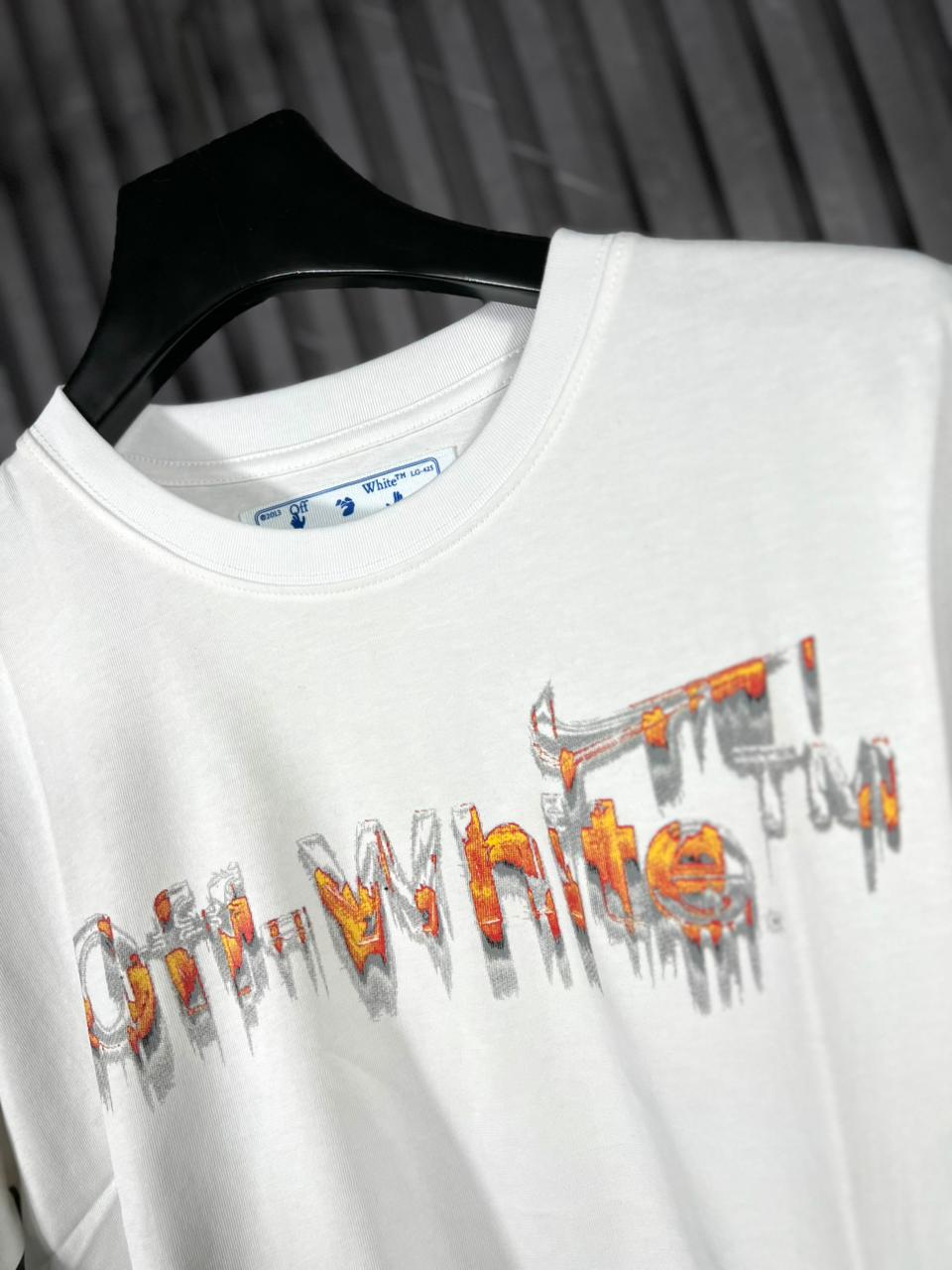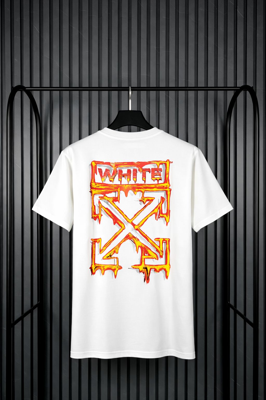Playera Off-White estilo streetwear premium en color blanco con logo Off-White™ frontal efecto dripping y diseño Dripping Arrows grande en la espalda en tonos rojo y naranja. Confeccionada en algodón de alta calidad que ofrece comodidad, suavidad y un look urbano moderno.