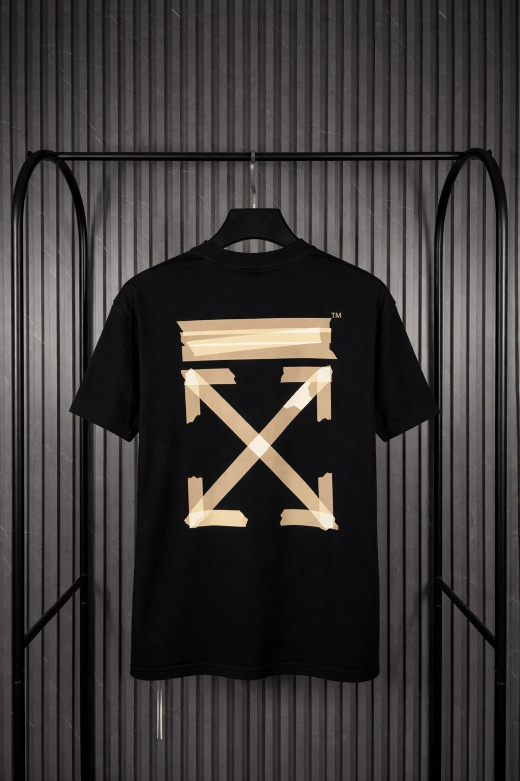 El diseño incorpora el reconocido símbolo de flechas cruzadas de Off-White, reinterpretado con un efecto visual que simula cinta adhesiva, aportando un estilo moderno y distintivo. Este tipo de gráficos forma parte de la identidad visual creada por Virgil Abloh, donde los elementos industriales y gráficos minimalistas se fusionan con la moda urbana de lujo.