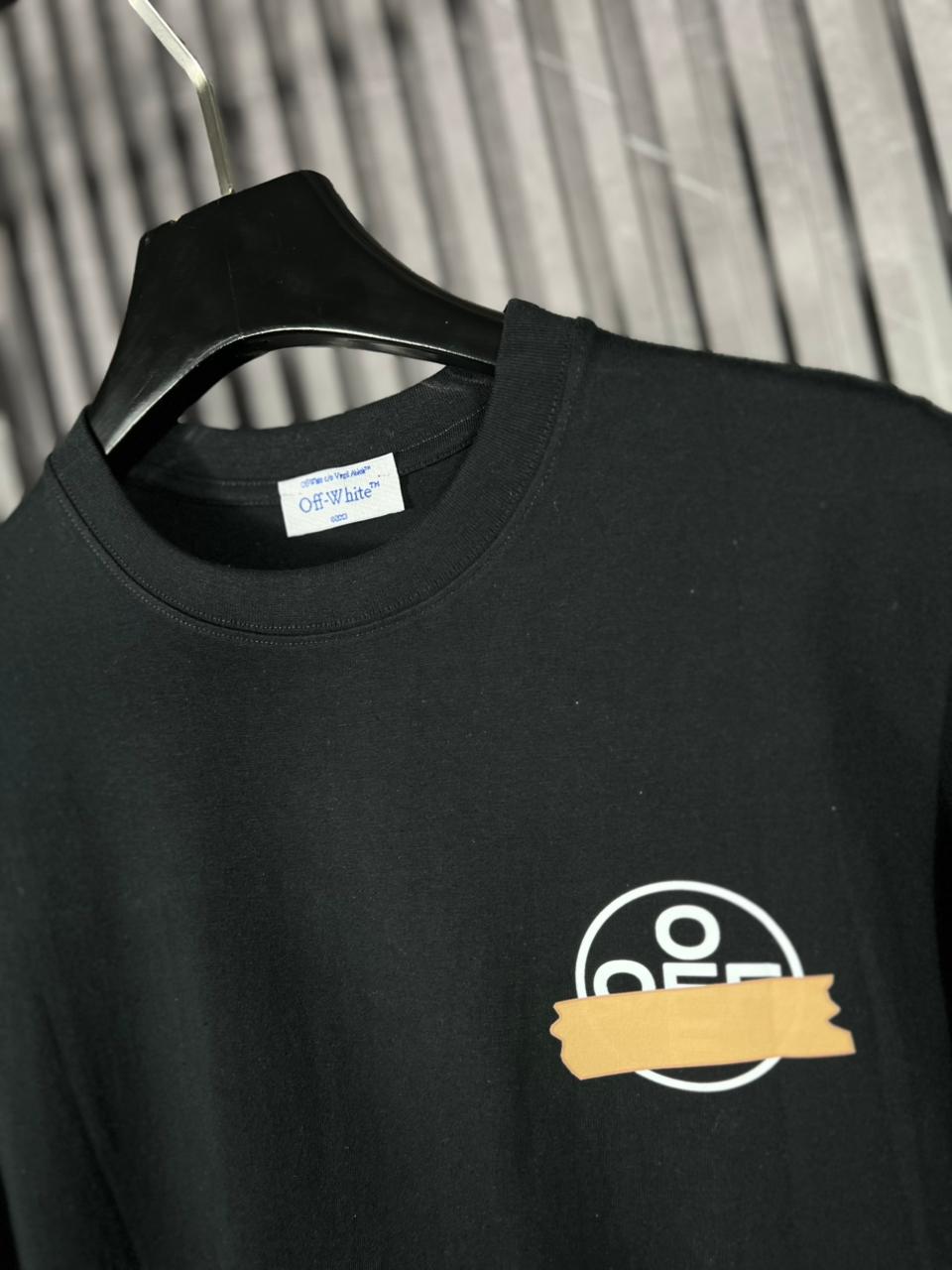Playera Off-White estilo streetwear premium en color negro con logo circular OW en el pecho y diseño Tape Arrows grande en la espalda, inspirado en el icónico gráfico de flechas de la marca con efecto cinta. Confeccionada en algodón de alta calidad que ofrece comodidad, suavidad y un look urbano moderno.